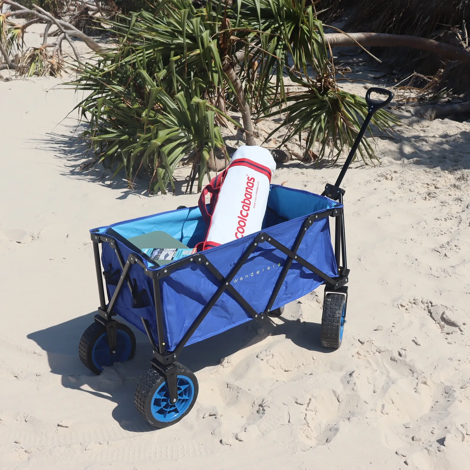 The Wanderer Quad Fold Beach Cart (12.8KG) is a sturdy, all-terrain trolley designed to carry beach gear with ease, featuring large, sand-friendly wheels with bearings and a spacious foldable frame. Load capacity 100KG.